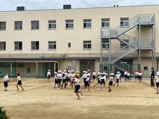 2年生の体育の授業です。2学級合同で、ドッヂボールを行っています。