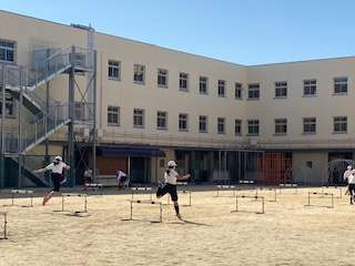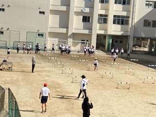 6年生の体育の授業では、ハードルのタイムを計測しています。皆さん、ハードルを倒さず上手に越えていきます。