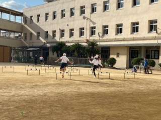 5時間目は、ハードルのタイムを計測。11秒かかる児童もいれば、8秒台の児童もいます。お昼は、ほのかに暖かく、ちょっと走れば汗ばみます。スタート前に「次は7秒台をめざせ!」と、送り出しましたが、結果は如何に?