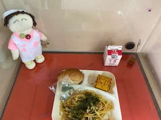 本日の給食は、ウィンナーときのこの醤油風味スパゲティ、焼きとうもろこしです。