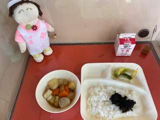本日の給食は、関東煮、白菜の甘酢和え、海苔の佃煮です。