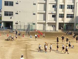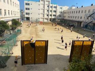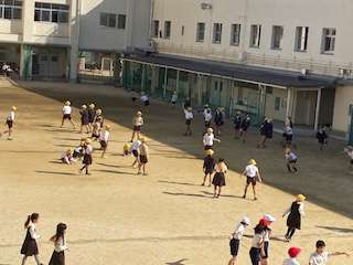 写真の左奥は、校舎建替え工事の壁を建て始めています。まもなく、3m程度の壁で運動場は区切られます。それまで、存分に遊んでくださいね^_^