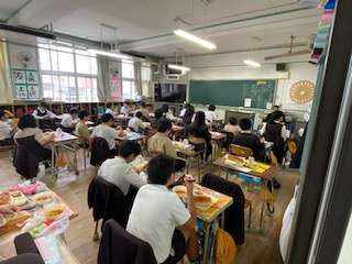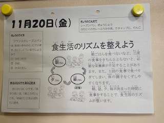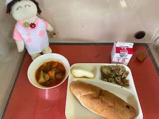 本日の給食は、豚肉のカレー風味焼き、ケチャップ煮、りんごです。