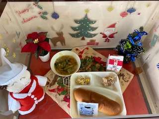 本日の給食は、鶏肉の唐揚げ、中華味噌スープ、もやしとコーンの甘酢和えです。