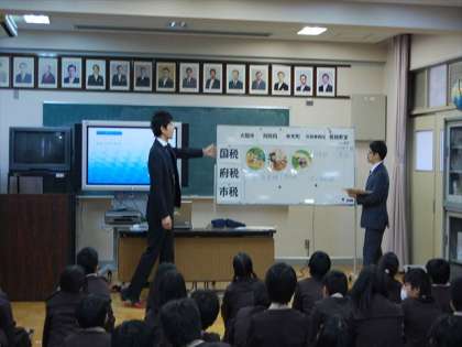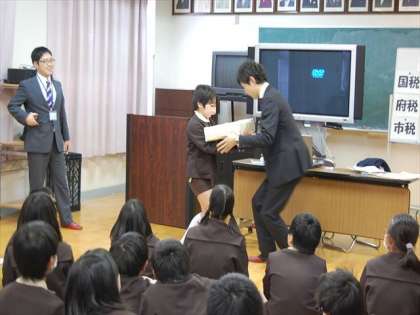 市税事務所の方にお越しいただき、税について学習しました。税の種類や、みんなの税金の使われ方について理解を深めました。