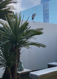 「サギたろう〜。」、「〇〇くん。みてみて!動物園みたい!」と玄関前の廊下から1年生の声がしました。いつもは朝早い時間に来ているサギの「サギたろう」ですが、今日はちょうど1年生の下校時刻に、池へやってきました。お見送りをしているようでした。