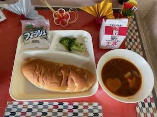 本日の給食は、ビーフシチュー、ブロッコリーのサラダ、ミニフィッシュです。