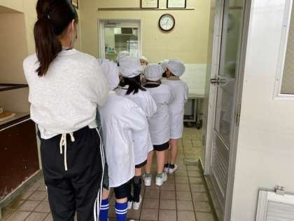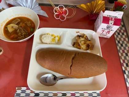 本日の給食は、豚肉と野菜のケチャップに、カリフラワーのピクルス、桃のクラフティです。