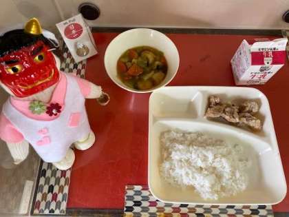本日の給食は、鶏肉の唐揚げ、まる天と野菜のうま煮、焼き海苔です。