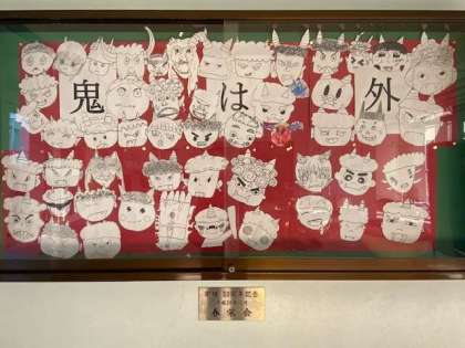 昨日は、124年ぶりの2月2日の「節分」でした。春日出小学校の玄関には、児童が作成した様々なお顔の鬼を掲示しています。表情豊かですねー。「鬼は外福は内」。鬼は出て行ったかな?