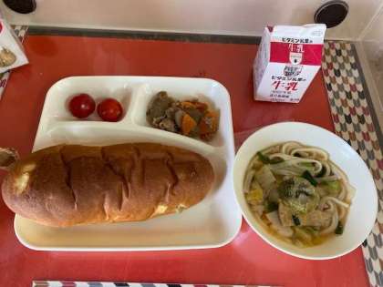 寒い日が続いていますが、温かいおうどんを召し上がれ!うどんは消化が良く、すぐにエネルギーになります。運動する前や集中力を高めたい時に最適です。今日は、トマトをつけました。トマトの栄養については、言うまでもなく、体には必要な栄養素が多く含まれています。たくさん食べて、風邪に負けない体作りをしましょう。