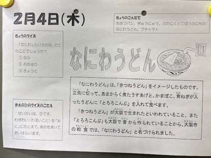 本日の給食は、豚肉とごぼうの煮物、なにわうどん、プチトマトです。