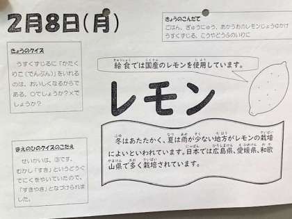 本日の給食は、赤魚のレモン醤油かけ、うすくず汁、高野豆腐の炒り煮です。