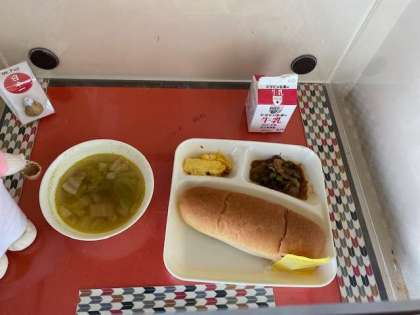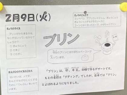 本日の給食は、牛肉のデミグラスソース煮、コーンと白菜のスープ、かぼちゃのプリンです。
