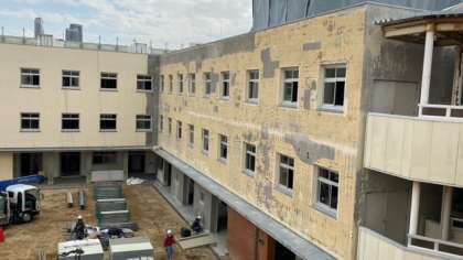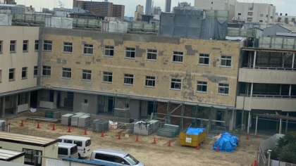 校舎建て替え工事が進んでいます。覆われていたシートが外れました。外壁塗装が削られて、廃屋のような姿に!
