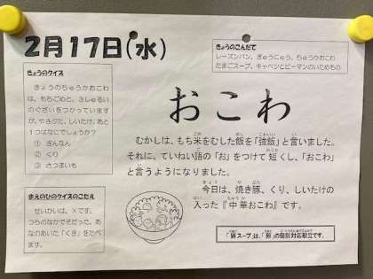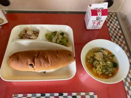 本日の給食は、中華おこわ、たまごスープ、キャベツとピーマンの炒め物です。