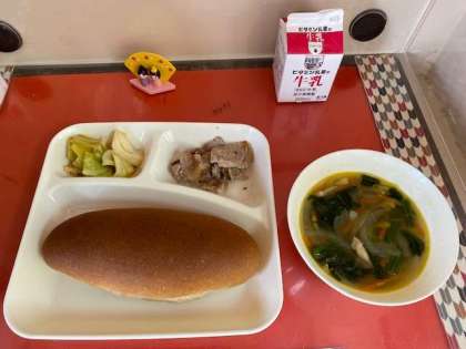 本日の給食は、豚肉のガーリック焼き、スープ、サワーソテーです。