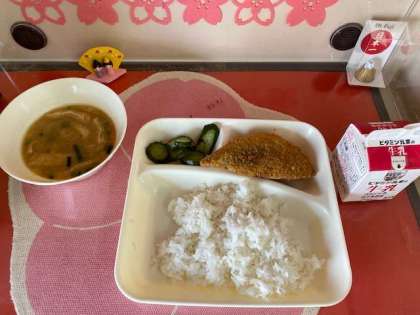 本日の給食は、イワシのフライ、味噌汁、きゅうりの赤じそ和えです。