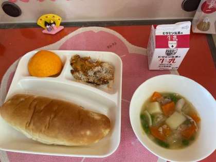 本日の給食は、豆腐のミートグラタン、押し麦と野菜のスープ煮、デコポンです。