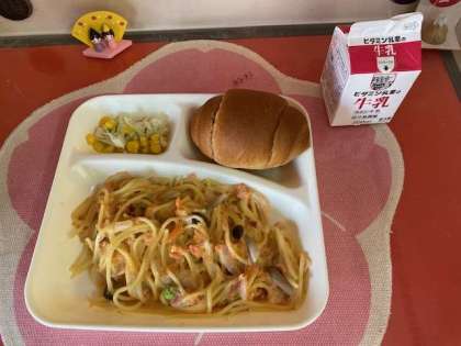 本日の給食は、鮭のクリームスパゲティー、カリフラワーとコーンのサラダです。