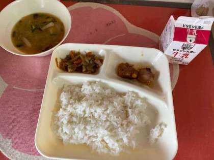 本日の給食は、鶏肉の照り焼き、サツマイモの味噌汁、きんぴらごぼうです。