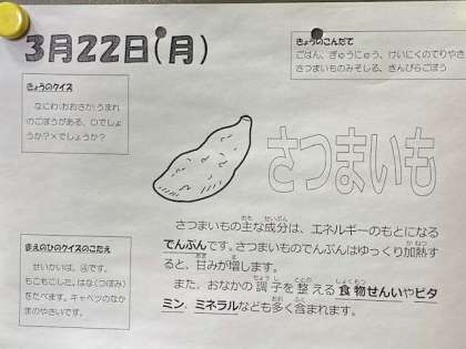 こんぴらごぼうは、食物繊維が豊富で、腸内環境を整える効果が期待されています。本日は、さつまいもも調理しており、体調管理に一役かっています。
