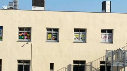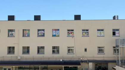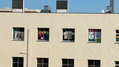 南校舎の3階の窓には、いきいき活動の皆さんが作成してくださいました、メッセージが掲示されています。