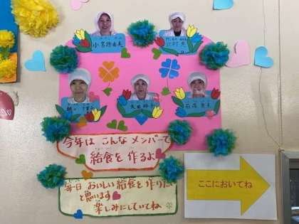 皆さんの笑顔と健康な身体作りのために、美味しい給食を作るようがんばりますので、よろしくお願いします^_^ 給食調理員より