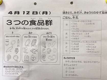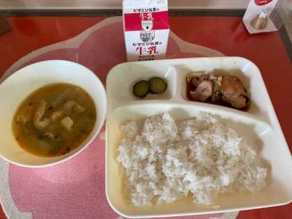 味噌汁には、ジャガイモ、玉ねぎ、キャベツ、人参、大根の葉が入っています。野菜をたくさん入れていますので、体調が整います。給食は、バランスよく作っていますので、残さずしっかり食べましょう。