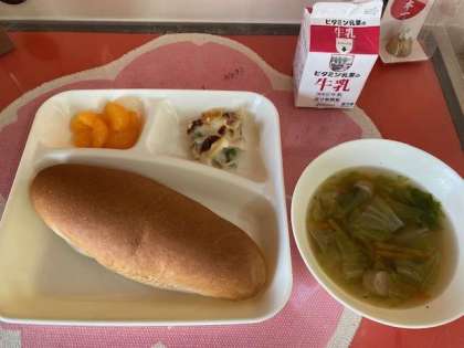 今日の給食は、マカロニグラタン、レタスのスープ、みかんです。