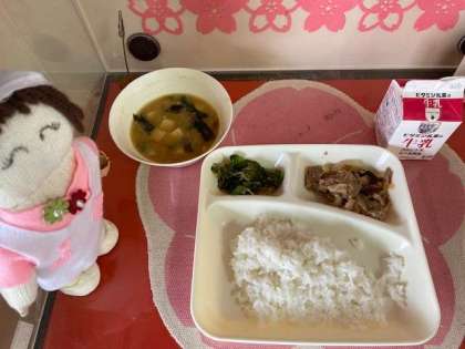 今日の給食は、豚肉の生姜焼き、味噌汁、じゃこピーマンです。