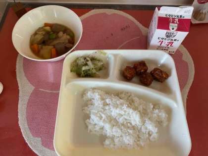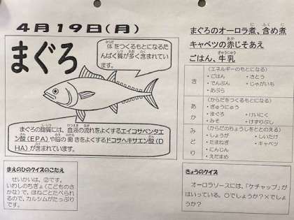 今日の給食は、マグロのオーロラ煮、含め煮、キャベツの赤じそあえです。