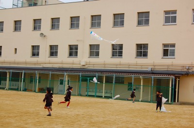 自分たちでつくった「たこ」を、校庭で飛ばしていました。