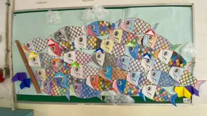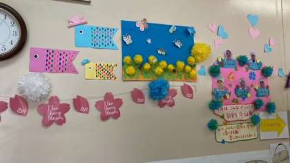 正面玄関入ってすぐ、1年生の教室の前、給食室の中、それぞれに「こいのぼり」が泳いでいます。