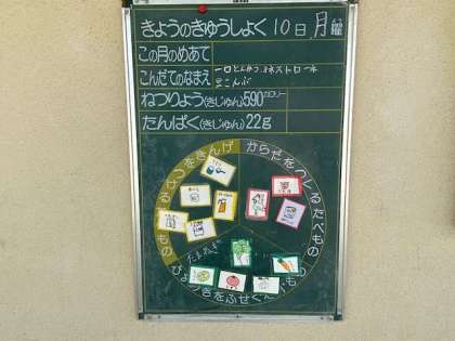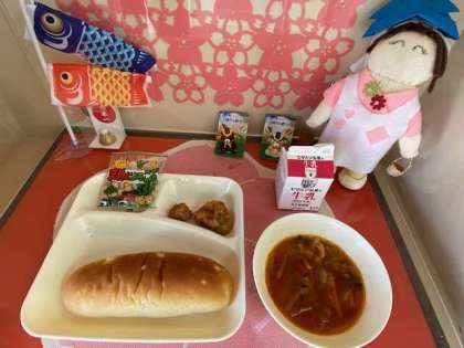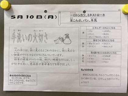 今日の給食は、1口とんかつ、ミネストローネ、豆こんぶです。