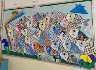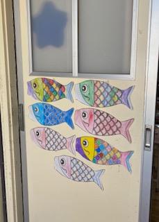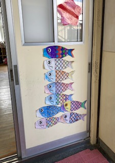 図工の学習で取り組んだ「こいのぼり」と、折り紙の「かぶと」、「アヤメ」を子どもたちと掲示しました。しばらくは、通常通りの時間割で学習が進めることが難しいですが、この掲示の青空を泳ぐこいのぼりのように、カラフルにそれぞれの色を活かして、楽しい5月を過ごしましょう。