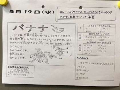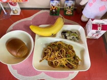 今日の給食は、カレースパゲティー、キャベツのひじきドレッシング、バナナです。