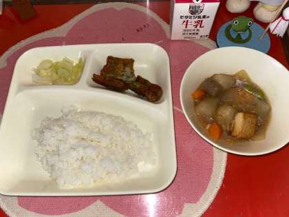 今日の給食は、ちくわのいそべ揚げ、厚揚げと里芋の煮物、あっさりキャベツです。