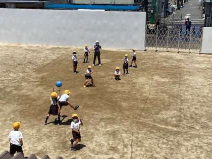 いい天気!体を動かす事が大好きな子どもたちは、外でドッヂボールをやっています。先生も入って、さぁー、誰を狙おうかなぁ?