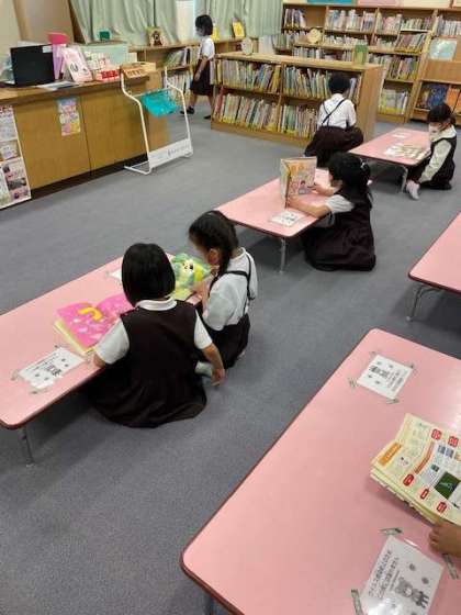 今日の給食の後の昼休みは、1年生の利用日でした。図書室では、図書委員会の5年生に、「本はどれでも読んでいいんですか。」「どこに座ったらいいですか。」と質問したり、好きな本をさがしたりして過ごしていました。