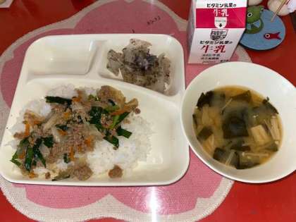 今日の昼食は、豚ひき肉とニラのそぼろ丼、味噌汁、キャベツの赤じそ和えです。