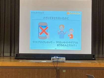 「なりすまし」「ネット詐欺」「高額請求」などの例をあげて、起こりうる身近なことであると教えてもらいました。子どもたちからは、「個人情報は載せない」「困ったら大人に相談する」などの意見が出ました。