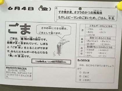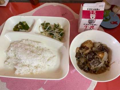 今日の給食は、すき焼き煮、オクラのかつお梅風味、もやしとピーマンの胡麻炒めです。