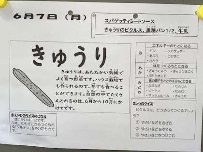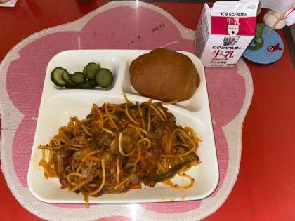 今日の給食は、スパゲッティーミートソース、きゅうりのピクルスです。