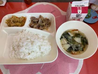 今日の給食は、豚肉の甘辛焼き、すまし汁、切干し大根の炒め煮です。