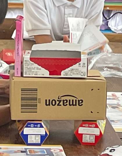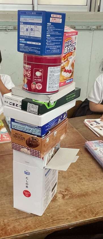 グループで話し合いながら、家から持ってきた箱や缶を積んだり並べたり…