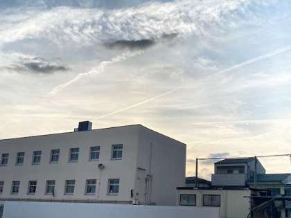 ふと、北の空を見上げると、夕方の空模様に灰色の雲と真っ白な雲、飛行機雲が校舎に向かって流れていると言う、幻想的な光景が見受けられ、思わず写真に撮ってしまいました。