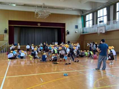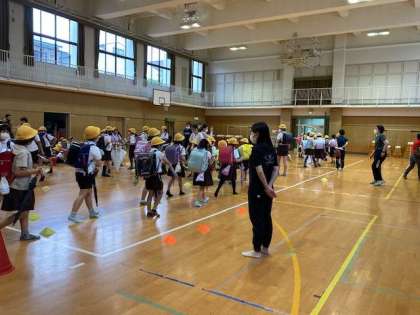 6年生が先頭に立ち、他学年の子どもたちを整列させていきます。点呼終了後に地区別に下校していきます。小雨模様でしたが、きちんと並んで下校していきました。