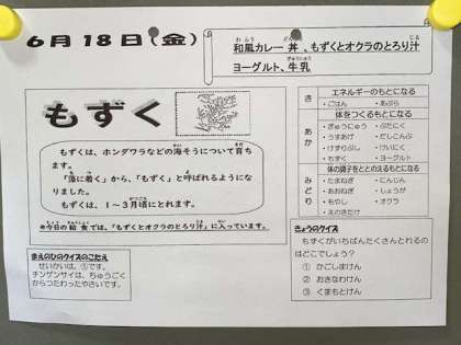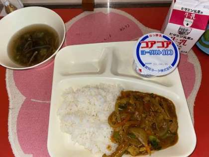 今日の給食は、和風カレー丼、もずくとオクラのとろり汁、ヨーグルトです。