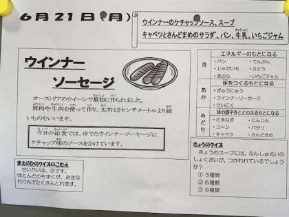 今日の給食は、ウインナーのケチャップソース、スープ、キャベツと三度豆のサラダです。
